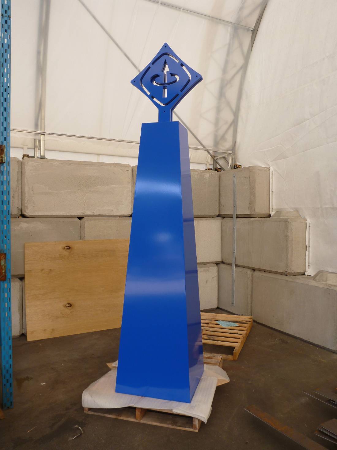 This statue was erected in 2011 as a centennial celebration of the Institute of Electrical and Electronics Engineers. Though not lit in any way the IEEE logo at the top of the monument seems to glow because of the ingenious use of coloured Plexiglas layered between aluminum, drawing in ambient light from the perimeter of the logo.